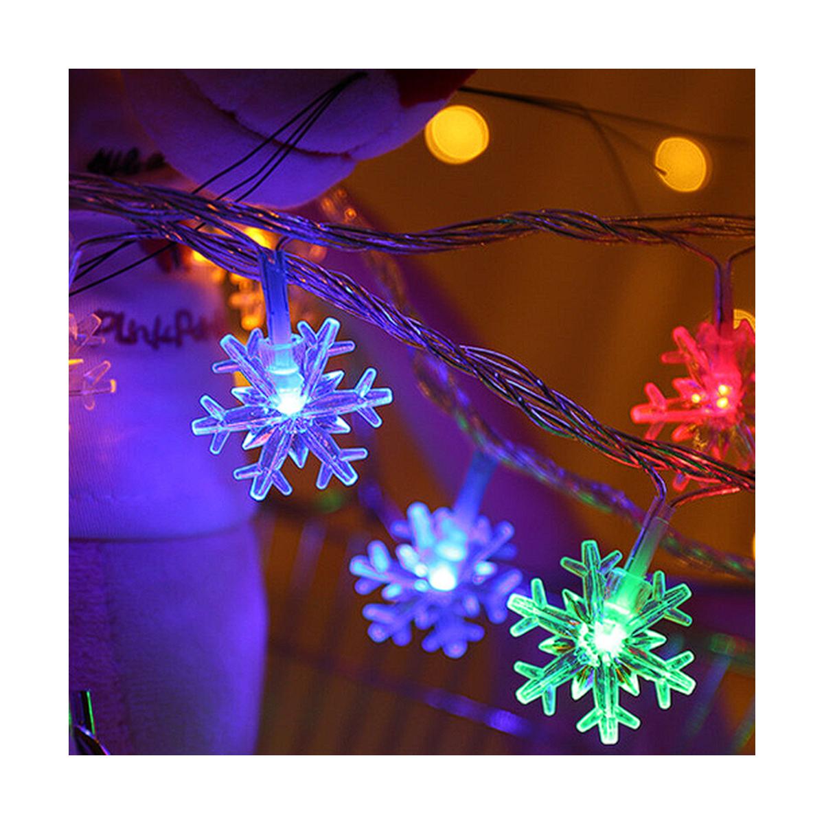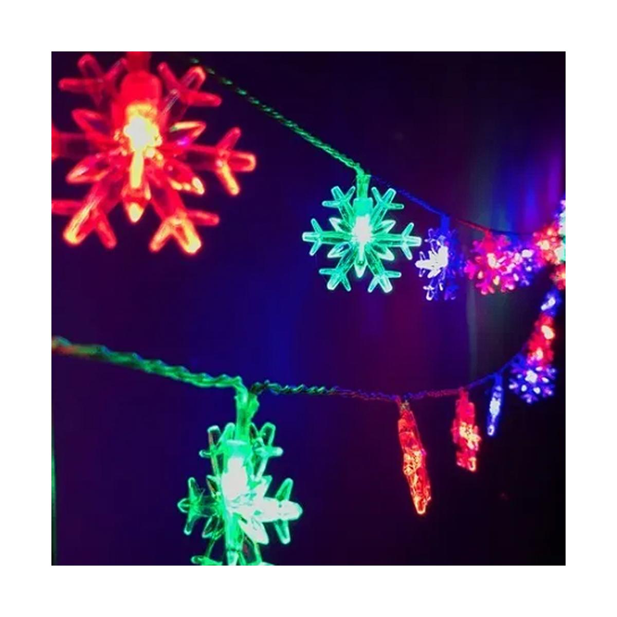 Guirnalda de 5 metros con luces LED multicolor en forma de copo de nieve. Conexión directa a 220V, bajo consumo de 1.6W, ideal para decorar interiores y exteriores con un ambiente festivo y acogedor.