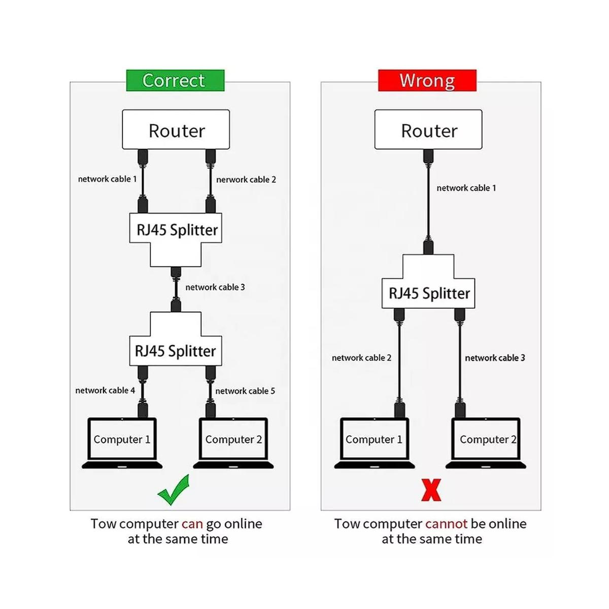 Este adaptador extensor RJ45 permite dividir una conexión de red en dos, pero no permite que dos computadoras se conecten a internet al mismo tiempo. Si se usa de forma incorrecta, solo un dispositivo podrá acceder a la red mientras el otro quedará sin conexión. Cómo conectar dos computadoras correctamente: Para que ambas computadoras tengan conexión simultáneamente, es necesario utilizar dos divisores RJ45 y dos cables LAN para crear una conexión eficiente. El esquema correcto sería: Desde el router, conectar dos cables de red a un divisor RJ45. Conectar este divisor a otro divisor RJ45 en el otro extremo del cable. Desde el segundo divisor, conectar un cable de red a cada computadora. Siguiendo esta configuración, ambas computadoras podrán conectarse a internet sin interferencias. Para una solución más eficiente, se recomienda usar un switch de red en lugar de un divisor.