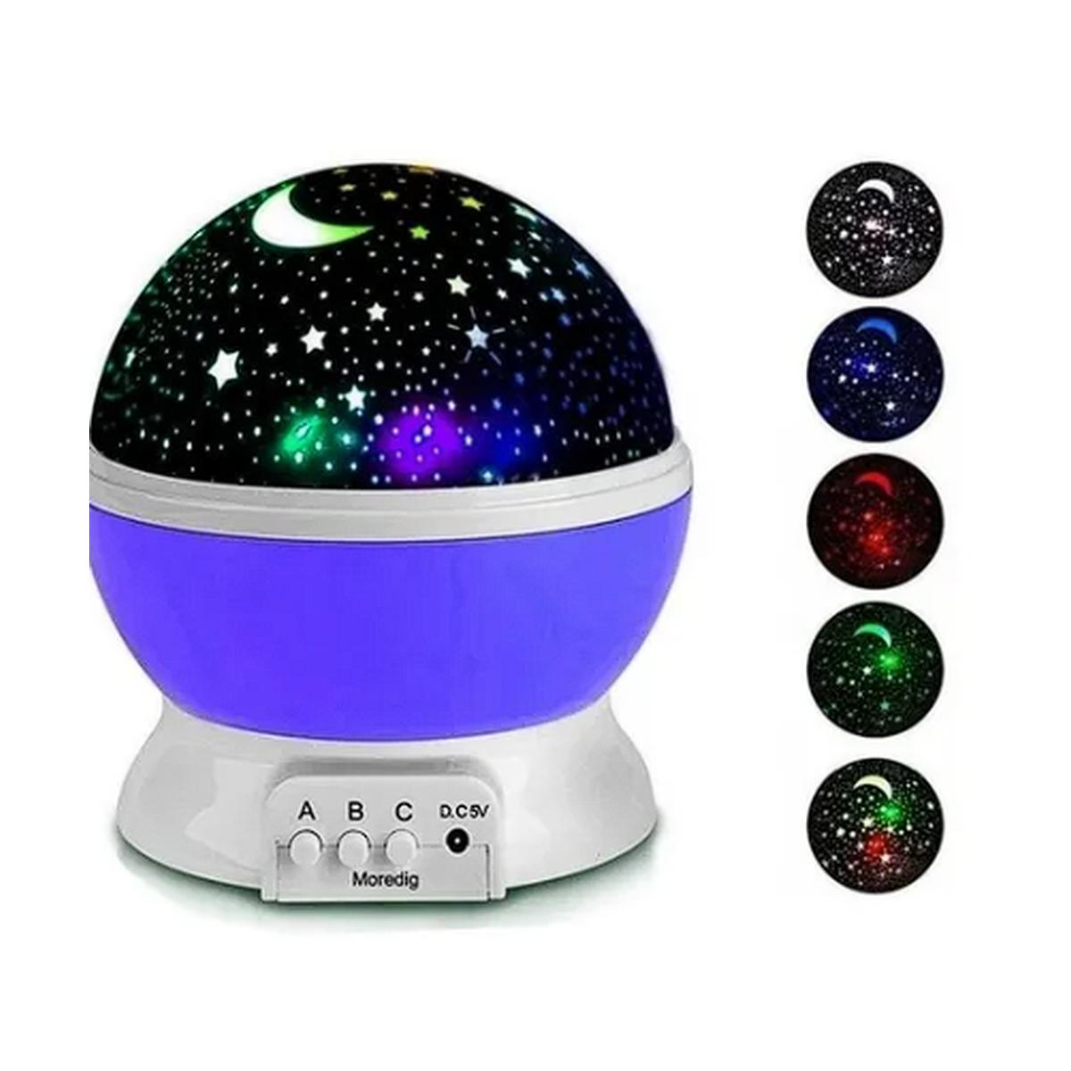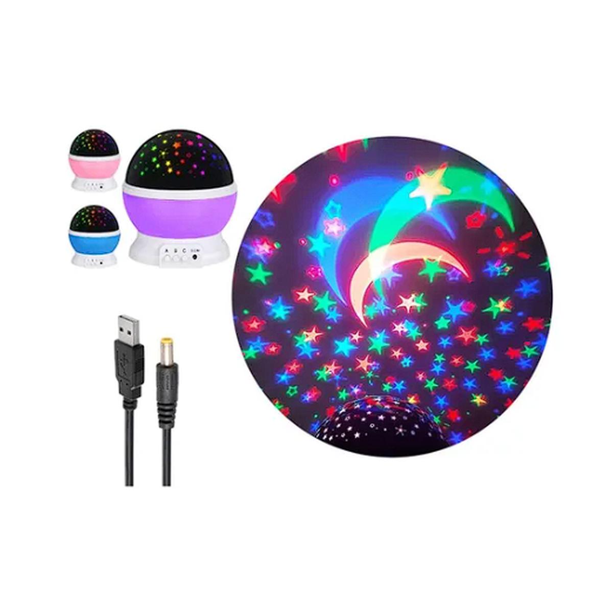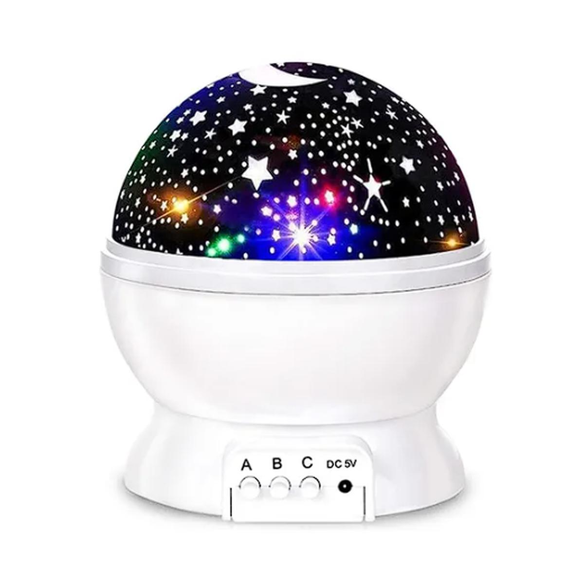 Transformá cualquier cuarto en un cielo estrellado. Esta lámpara proyecta estrellas, lunas y planetas en colores cálidos o multicolor, ideal como luz nocturna para peques. Funciona con pilas o USB, incluye botón de giro y cambio de color.