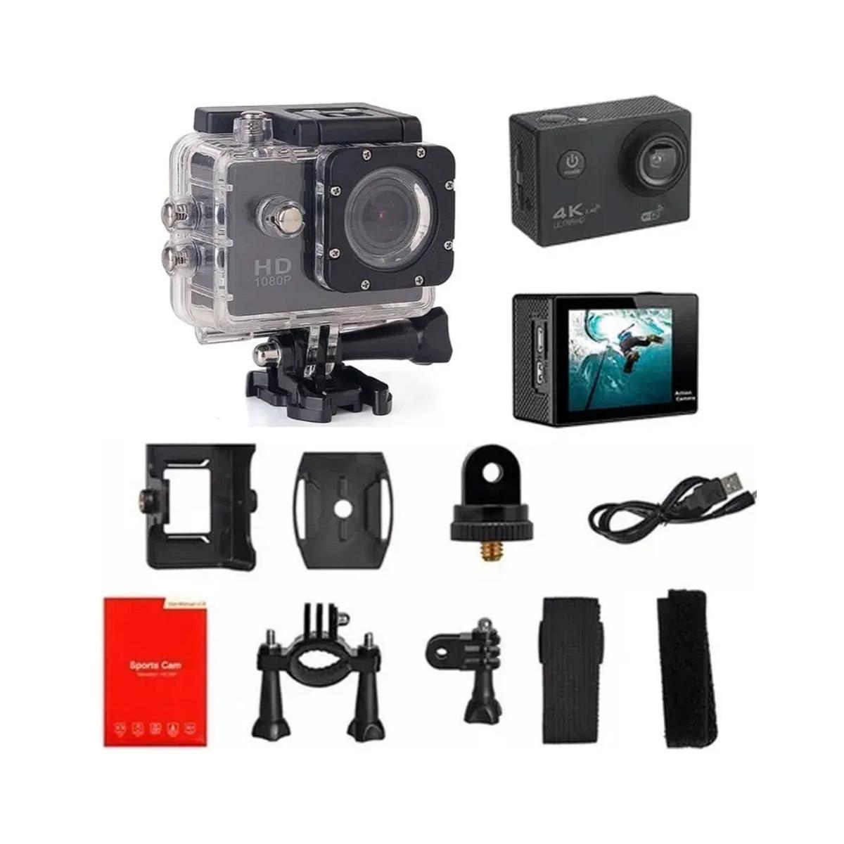 Ideal para aventuras extremas, esta cámara sport incluye carcasa sumergible hasta 30m, pantalla LCD de 2", batería recargable, grabación continua incluso mientras se carga, y múltiples modos de disparo. Soporta tarjeta microSD (hasta 32GB), graba en 720p o 1080p y viene con todo lo necesario para sujetarla a casco, bicicleta o usarla en mano.