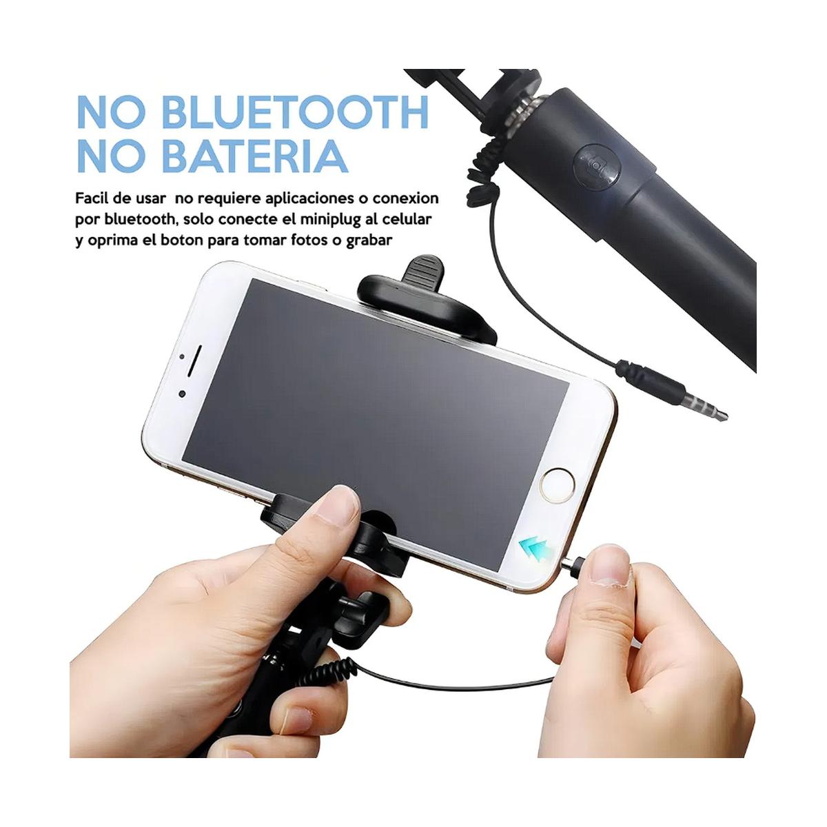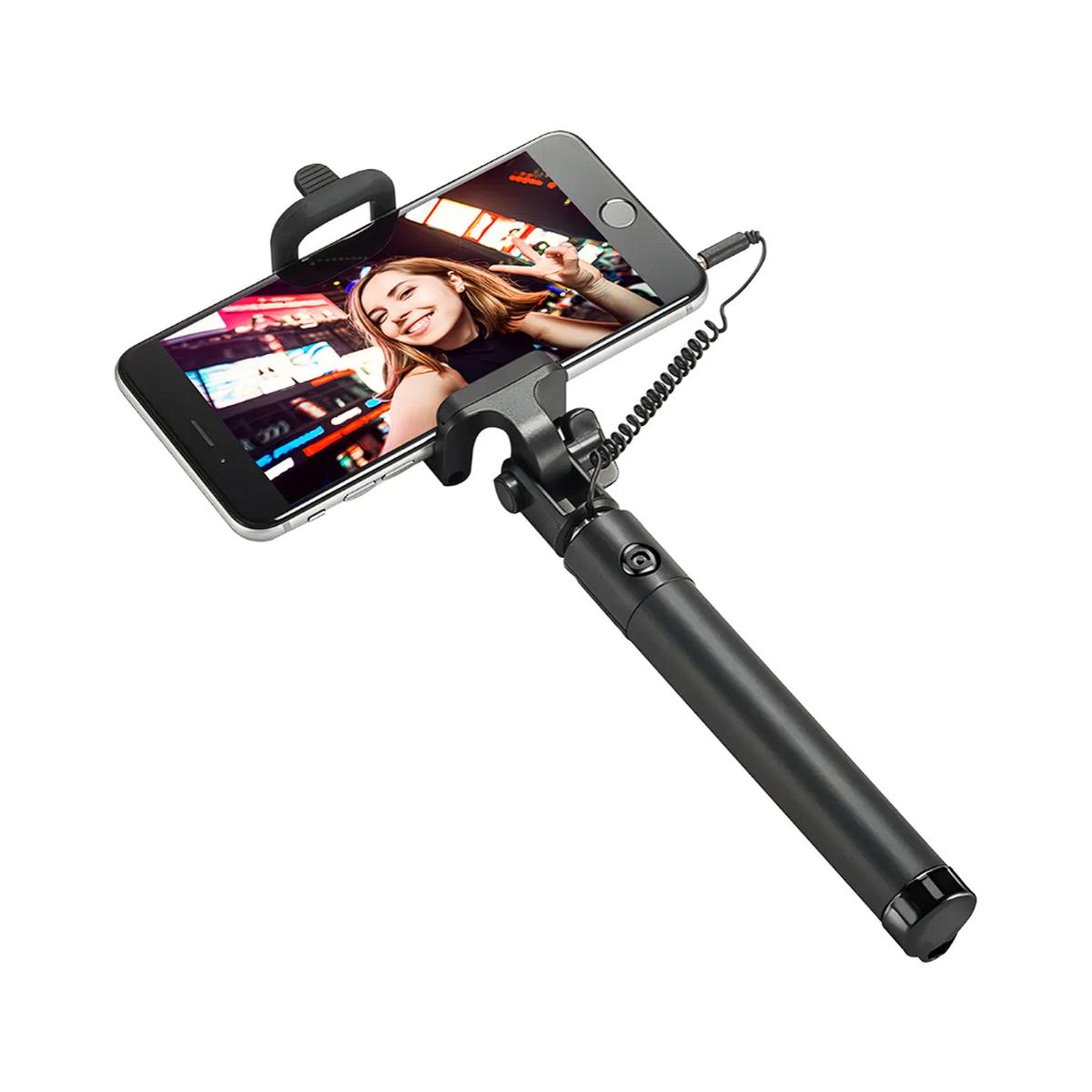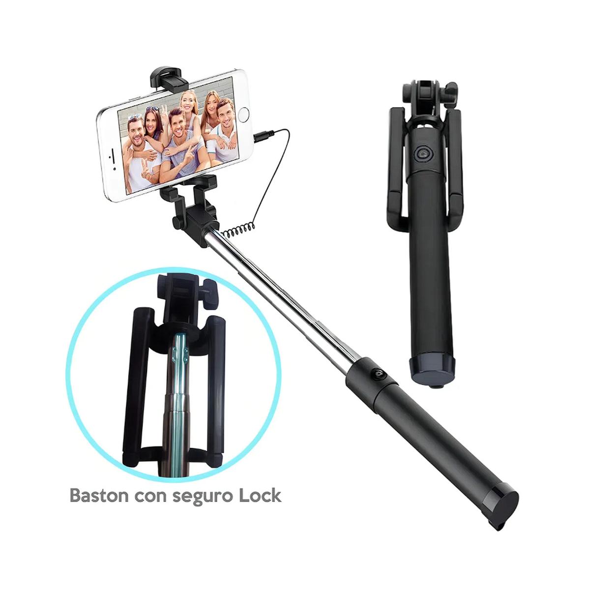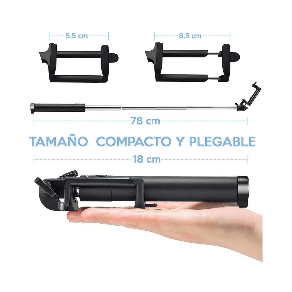 Palo extensible con conexión miniplug, ideal para selfies y fotos grupales. Longitud ajustable de 18 a 78 cm y diseño plegable para fácil transporte. Color negro, liviano y compatible con cualquier celular.