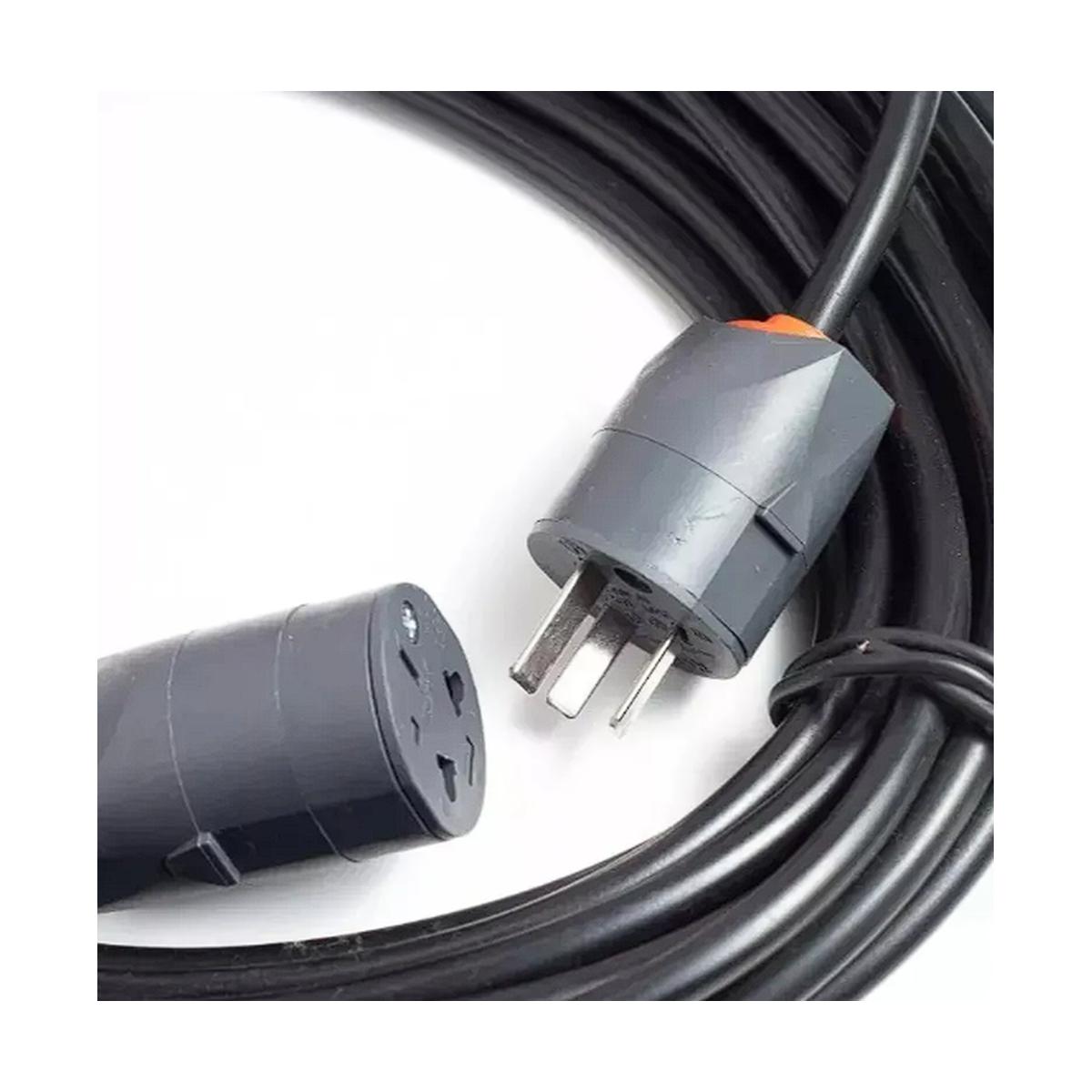 Extensión de 5 metros con ficha tipo Richi y toma multinorma para fichas tipo I y C. Cable de doble aislación en color negro con cabezal negro/naranja, ideal para uso doméstico con TV, luces, cargadores y más.