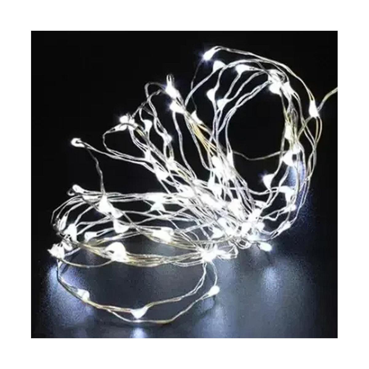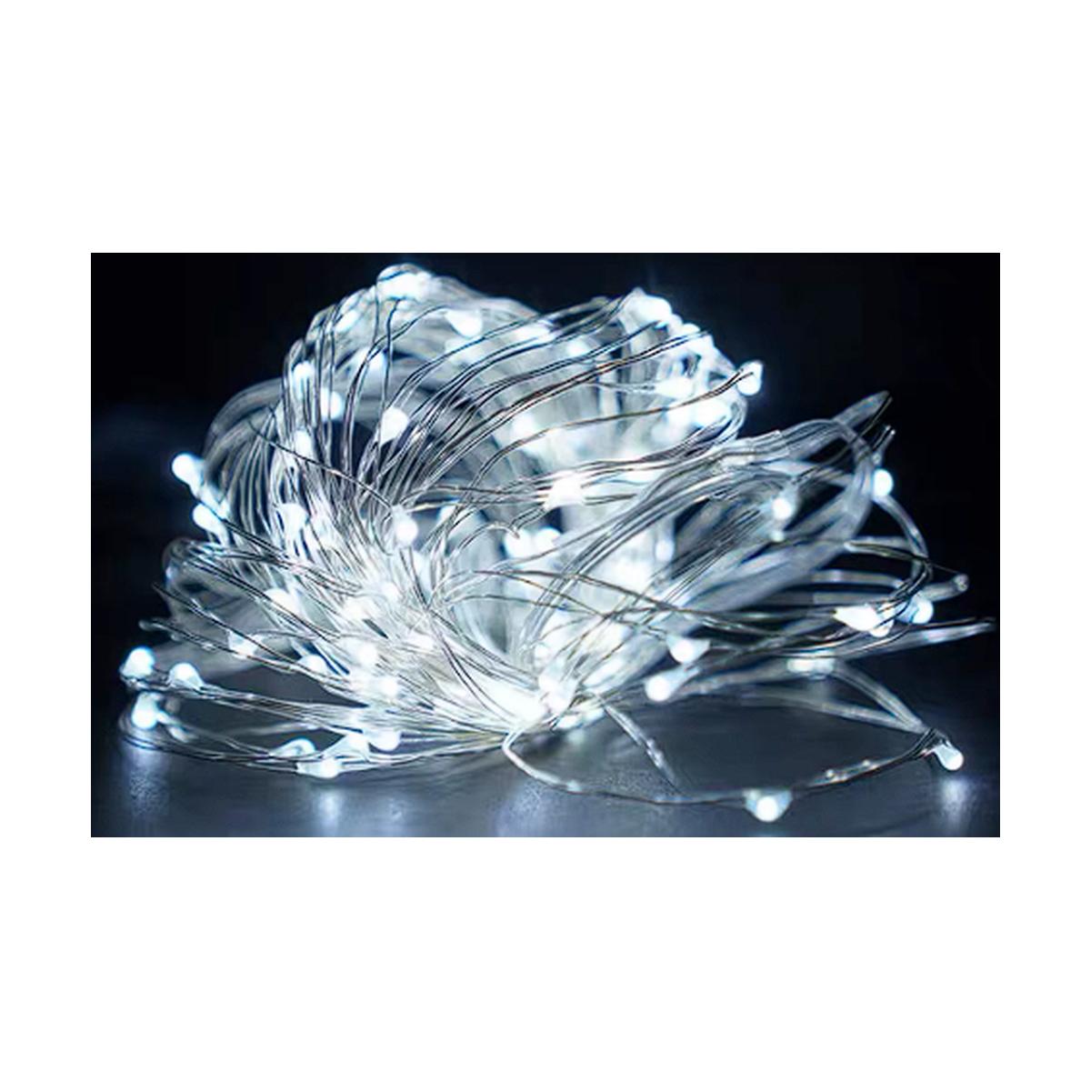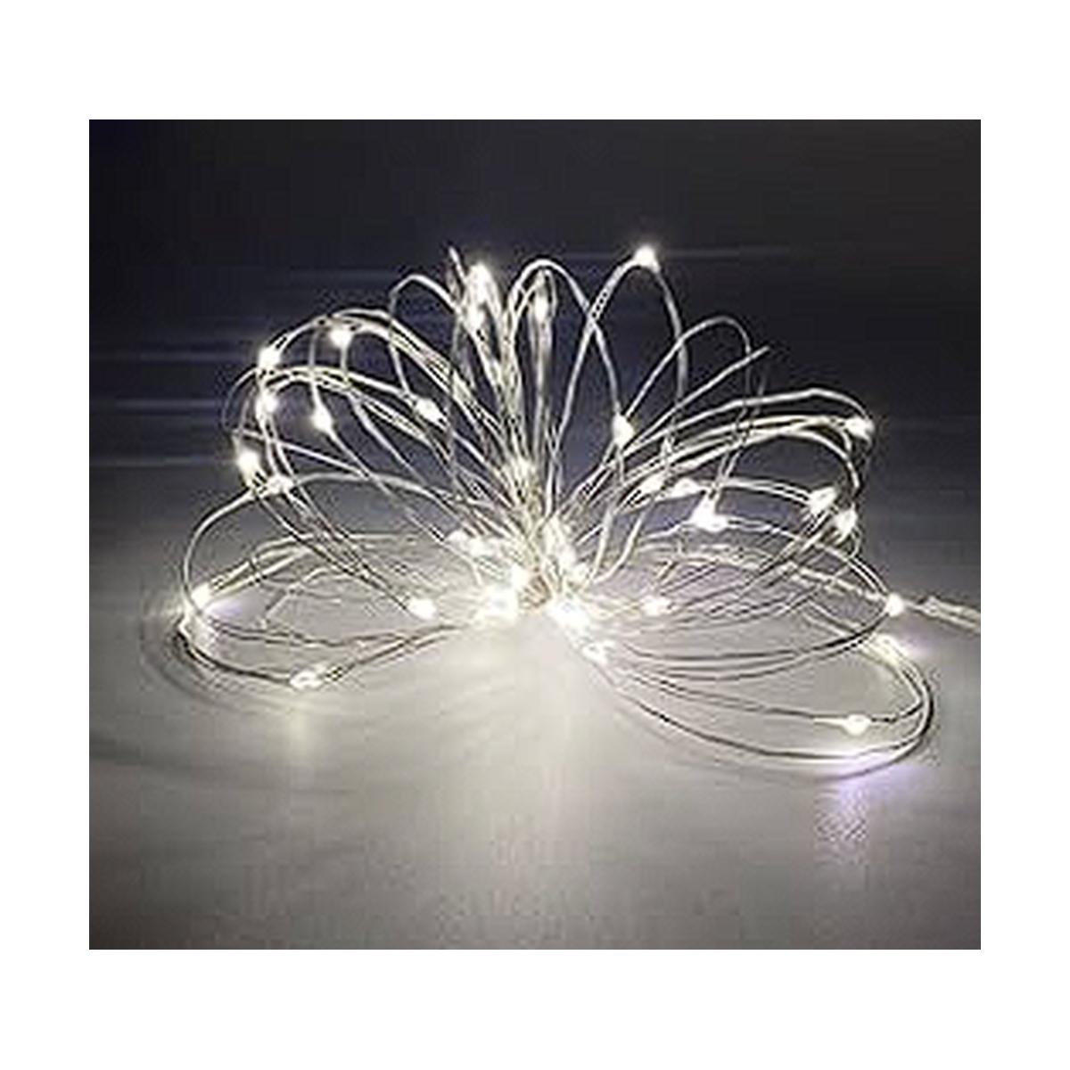 Guirnalda de 5 metros con 50 luces micro LED de bajo consumo, cable plateado flexible y moldeable, fácil de instalar y resistente al agua. Ideal para decoración de interiores y exteriores, adaptándose a todo tipo de ambientes y celebraciones.