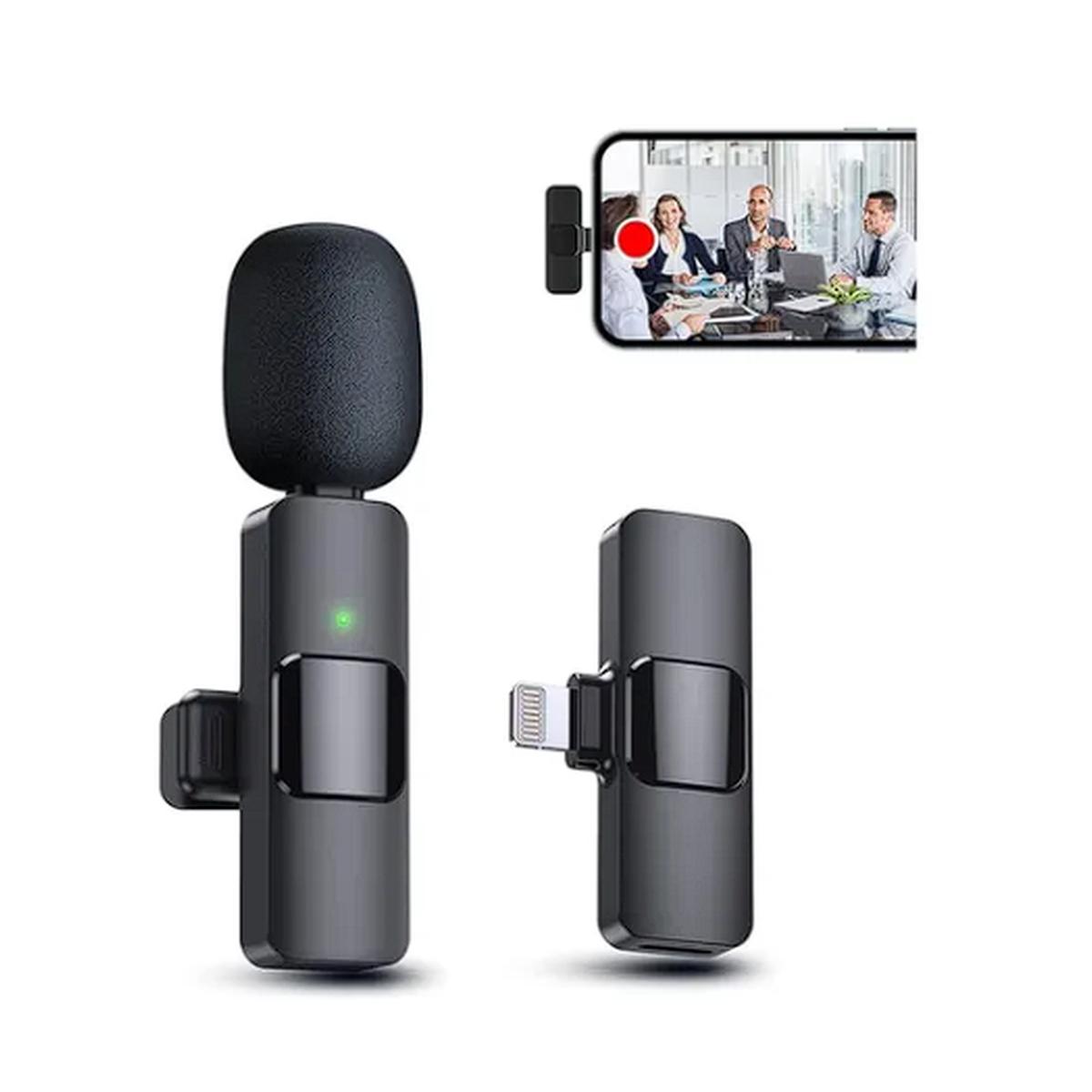 Micrófono inalámbrico de solapa compatible con dispositivos iPhone vía puerto Lightning. Ideal para entrevistas, vlogging, transmisiones en vivo y grabaciones de cursos. Captura clara y práctica, diseñado para uso directo y portátil.