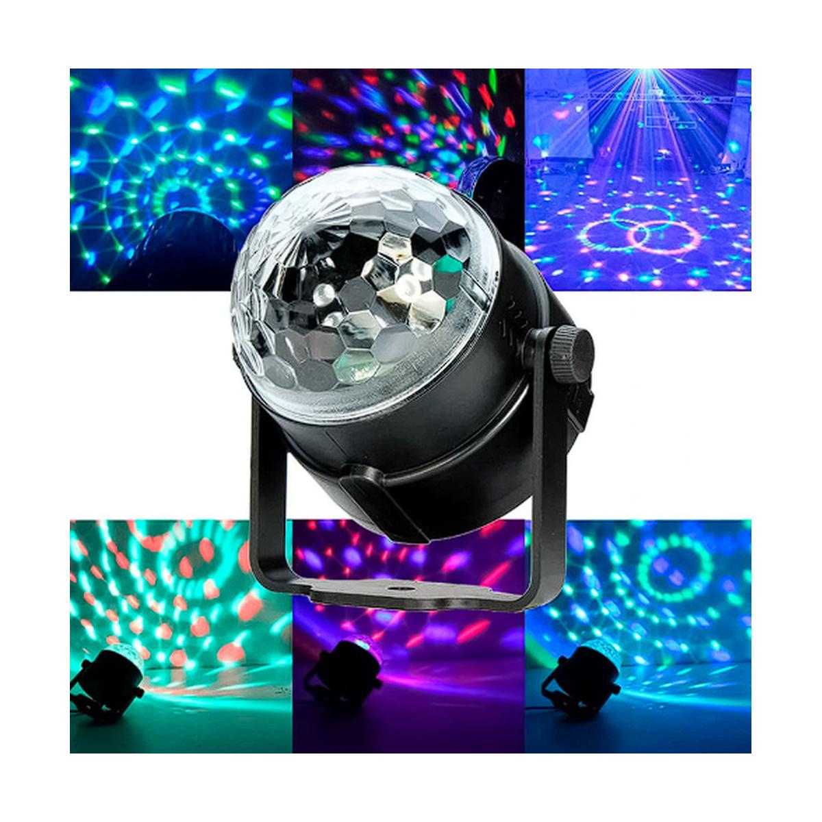 Esfera mágica de iluminación LED RGB con efectos que siguen el ritmo de la música. Ideal para fiestas, boliches, bares y eventos. Conexión directa a 220V, potencia de 3W, compacta y ligera (10x10x10 cm).